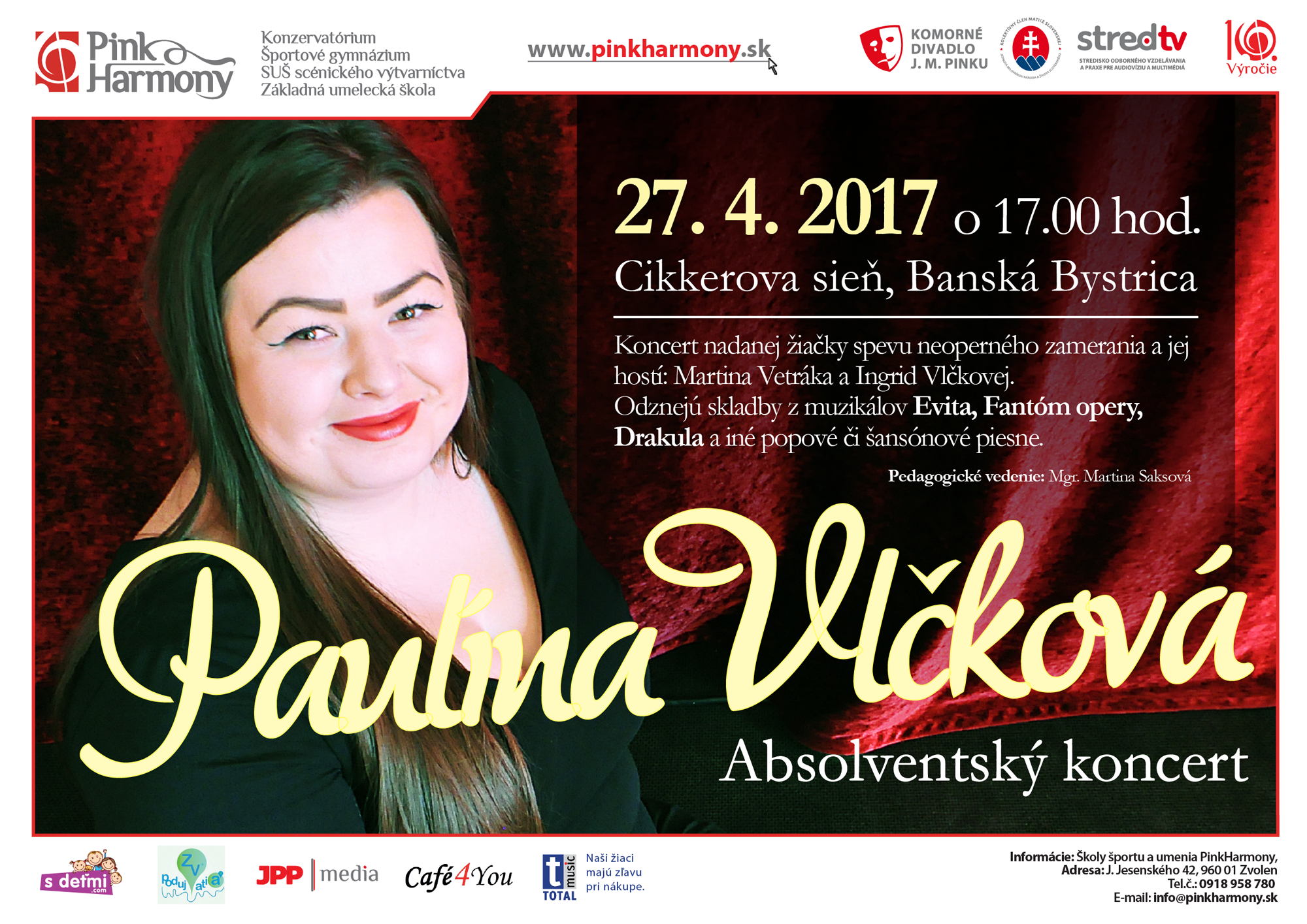 Srdečne všetkých pozývame na absolventský koncert nadanej žiačky spevu neoperného zamerania a jej hostí: Martina Vetráka a Ingrid Vlčkovej.
