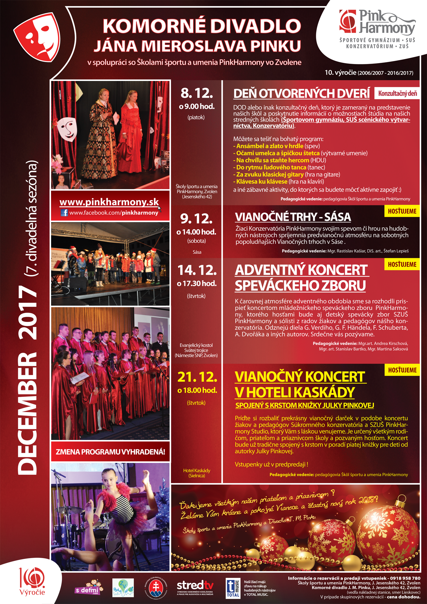 Program Komorného divadla J. M. Pinku na december 2017. V úvode mesiaca si isto nenechajte ujsť Deň otvorených dverí (konzultačný deň), v rámci ktorého sme si pre Vás pripravili bohatý program, nasledovať bude Predvianočný koncert na trhoch v Sáse, Adventný koncert speváckeho zboru v Evanjelickom kostole vo Zvolene a mesiac december uzavrieme tradičným Vianočným koncertom v hoteli Kaskády.