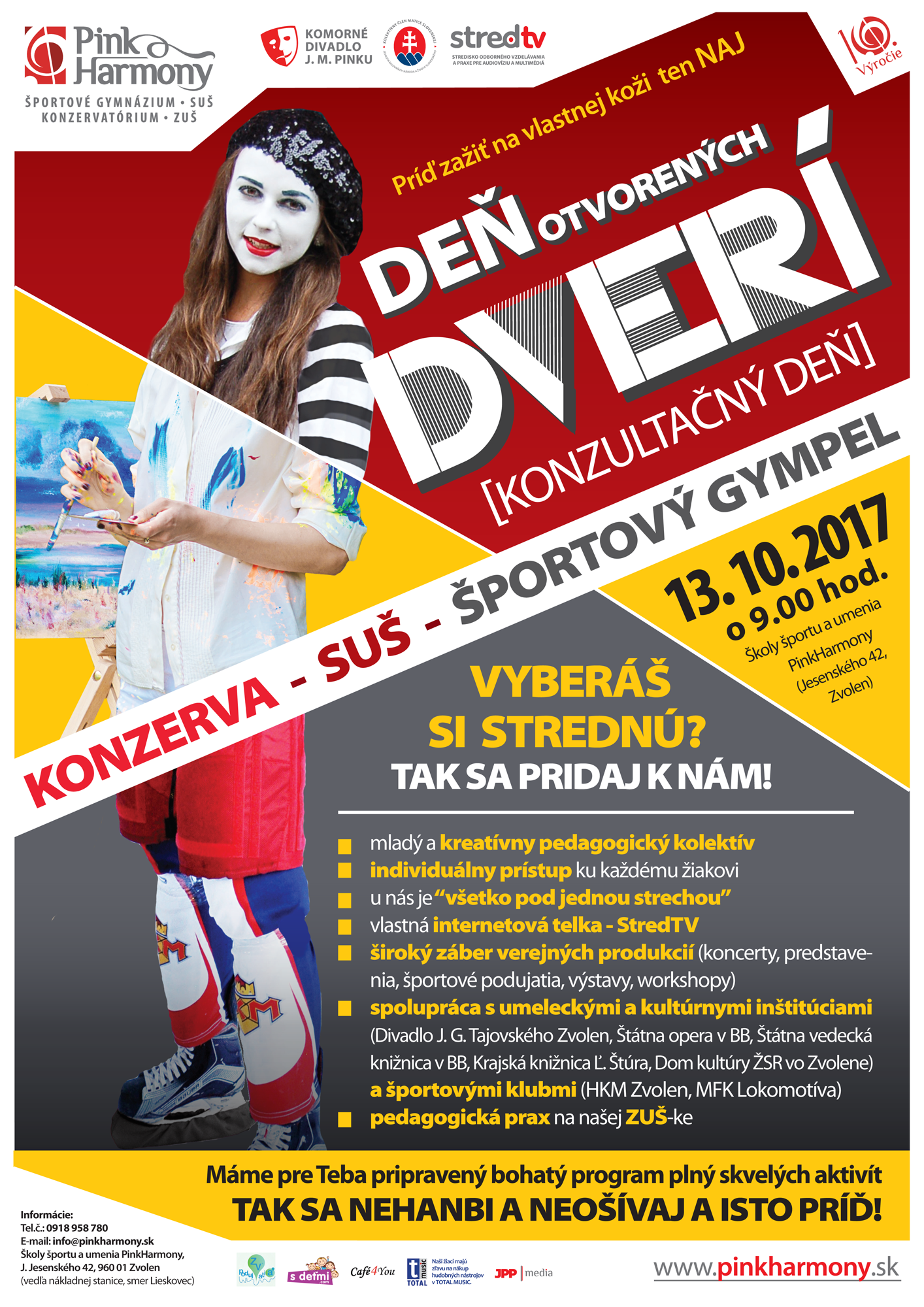 Srdečne všetkých pozývame na Deň otvorených dverí (konzultačný deň). Máme pre Vás pripravené množstvo skvelých aktivít, vďaka ktorým môžete našu školu a vyučovanie u nás spoznať na vlastnej koži 🙂 Okrem toho máte možnosť informovať sa o možnostiach štúdia na našich stredných školách (Športové gymnázium, Konzervatórium a SUŠ scénického výtvarníctva)