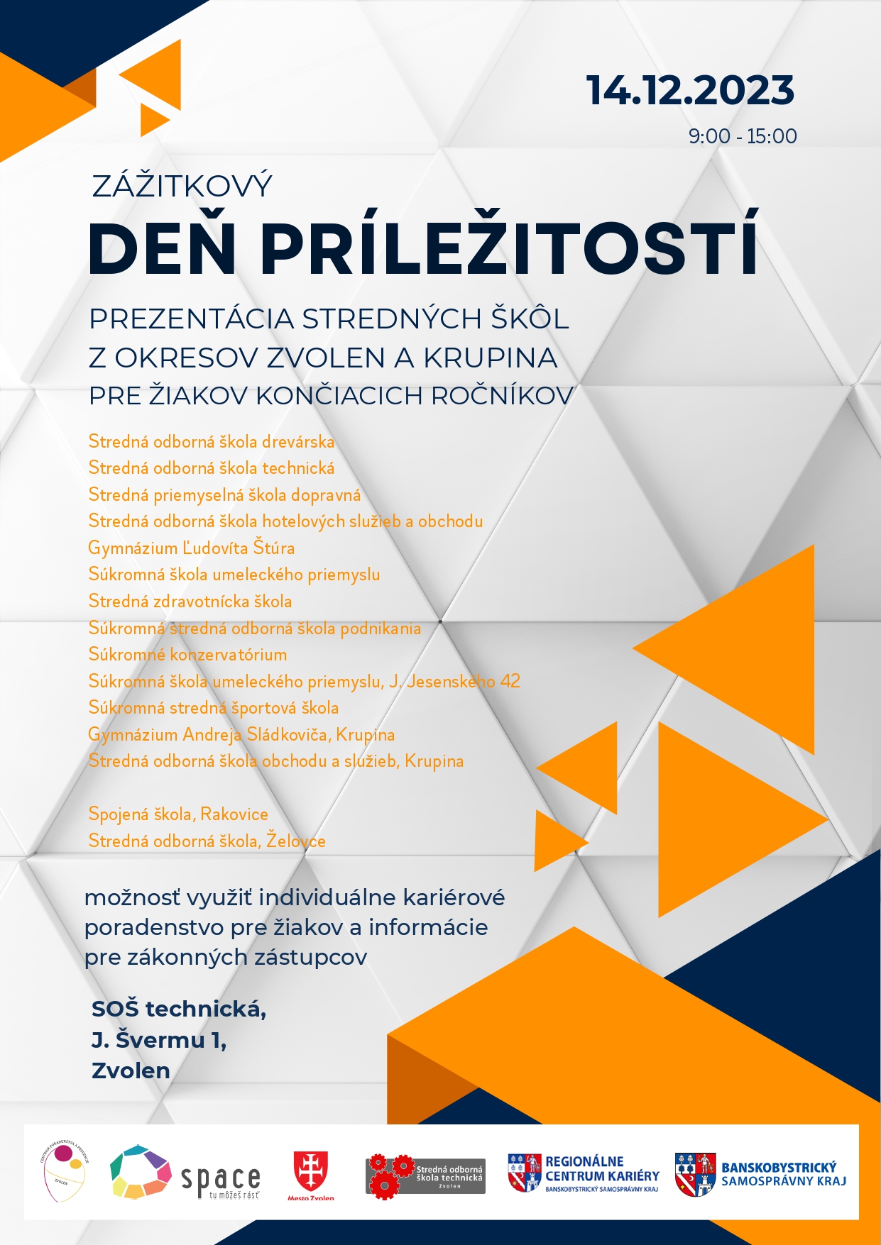 Posledná burza stredných škôl, ktorej sa v tomto kalendárnom roku zúčastníme bude zážitkový Deň príležitostí, kde sa Vám predstavia okrem našich troch stredných škôl aj ostatné stredné školy z okresov Zvolen a okolie.👍