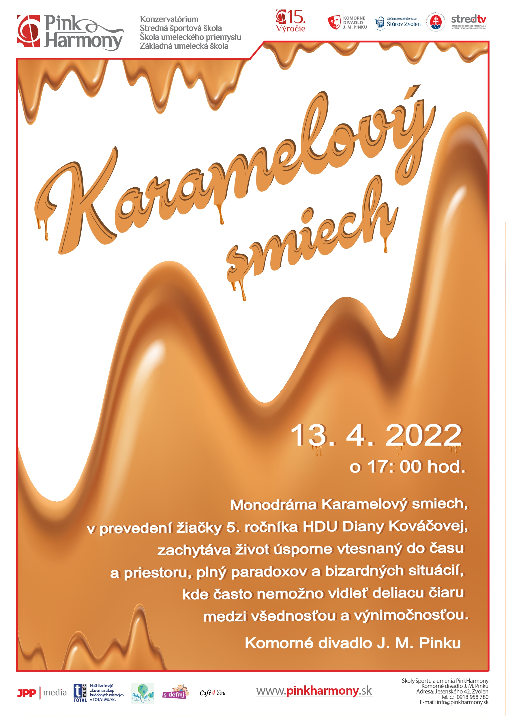 pozývame Vás na divadelné predstavenie ,,Karamelový smiech“ v podaní žiačky 5. ročníka HDU, Diany Kováčovej, ktorý zachytáva život úsporne vtesnaný do času a priestoru, plný paradoxov a bizarných situácií. Streda 13.4.2022 Komorné divadlo J.M.P. Pinku.