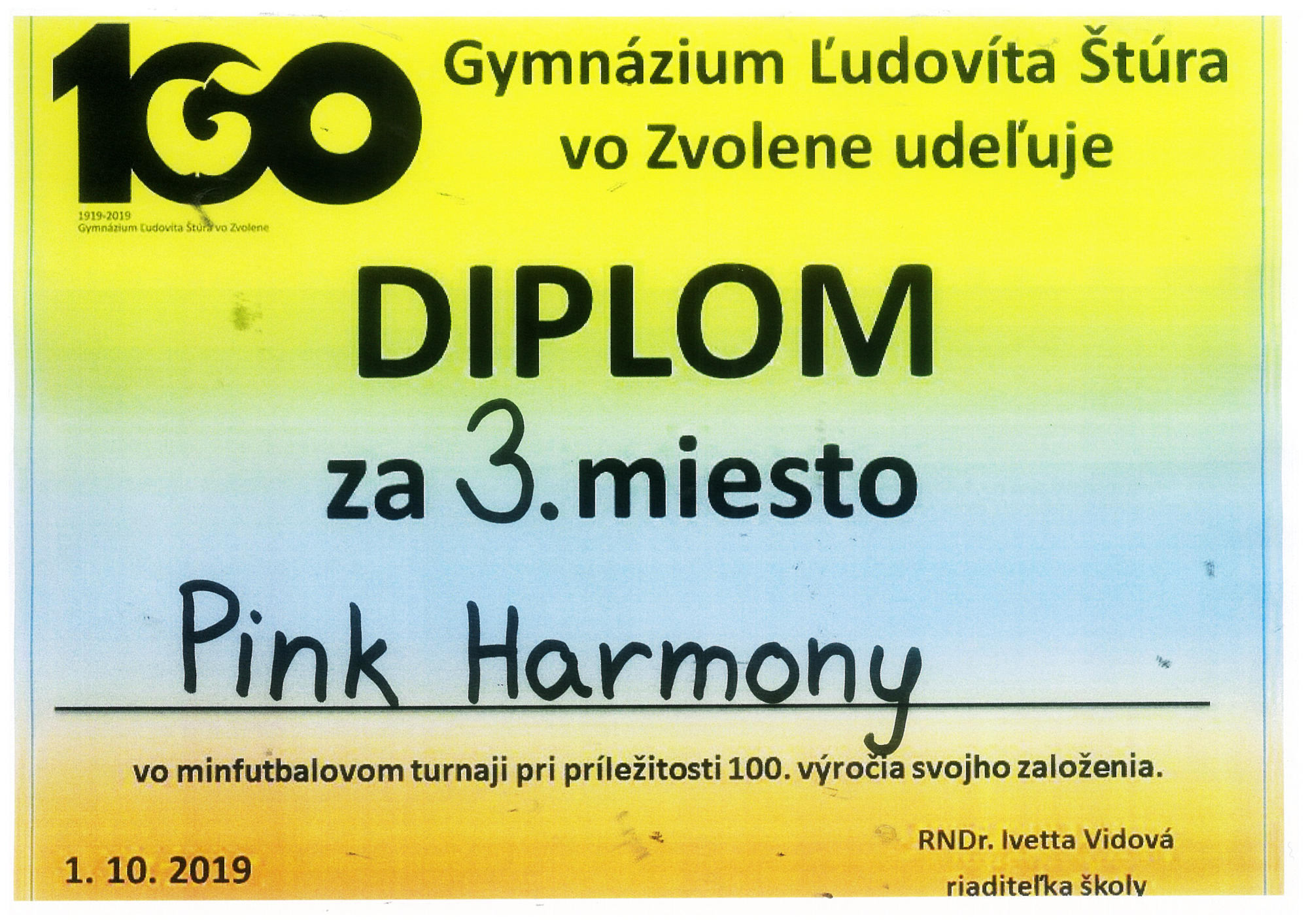 Žiakom Strednej športovej školy PinkHarmony – za 3. miesto v minifultbalovom turnaji pri príležitosti 100. výročia založenia Gymnázia Ľ. Štúra vo Zvolene, vo Zvolene, 1. 10. 2019