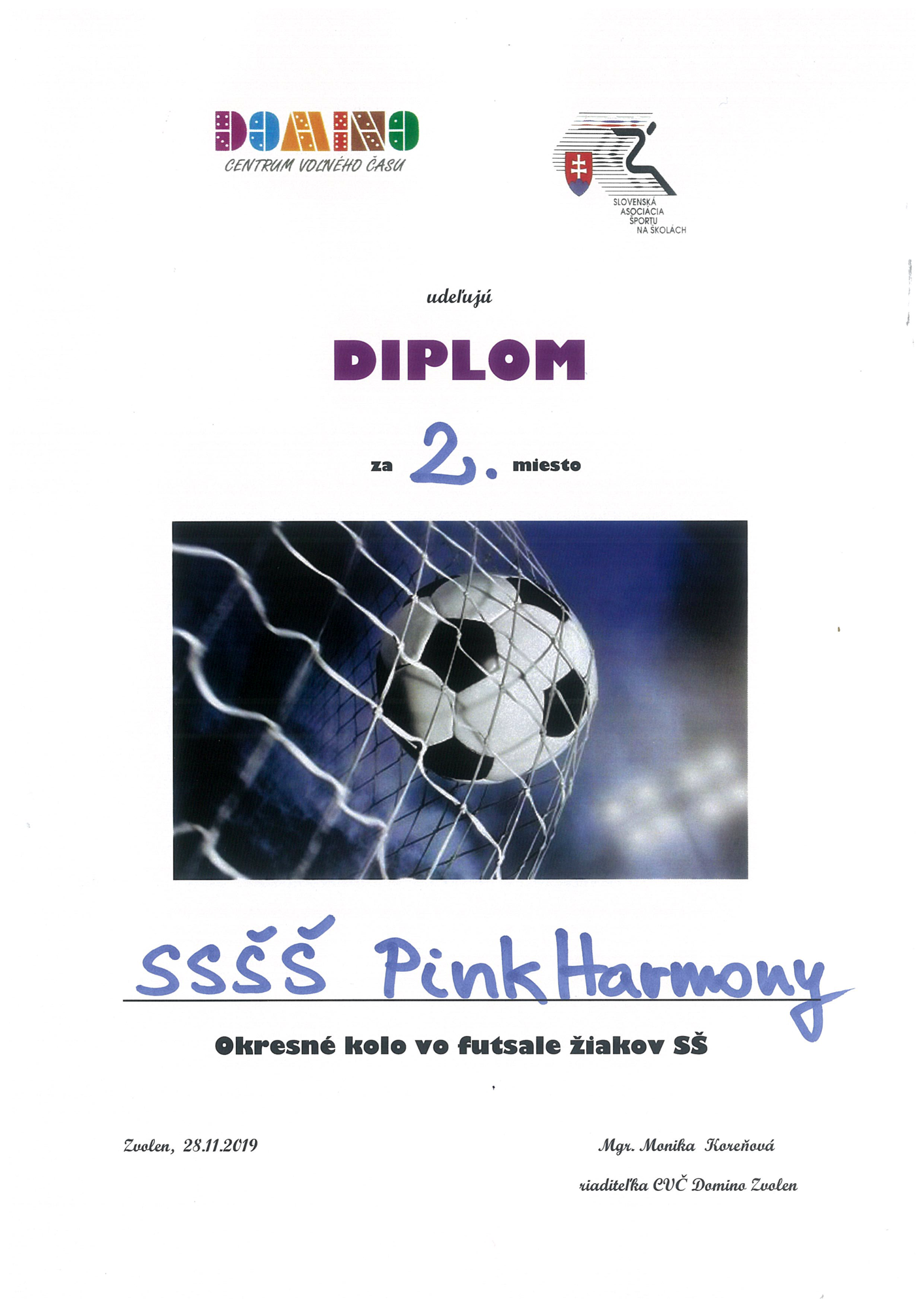 Žiakom Strednej športovej školy PinkHarmony – za 2. miesto vo futsalovom turnaji žiakov SŠ, vo Zvolene, 28. 11. 2019