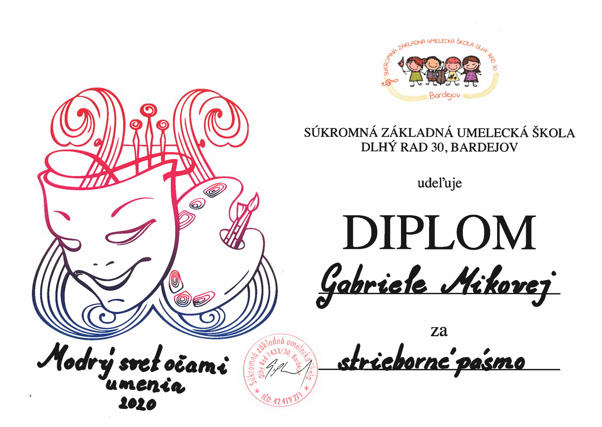 Gabriele Mikovej – SZUŠ PinkHarmony vo Zvolene – strieborné pásmo súťaže Modrý svet očami umenia 2020, Bardejov