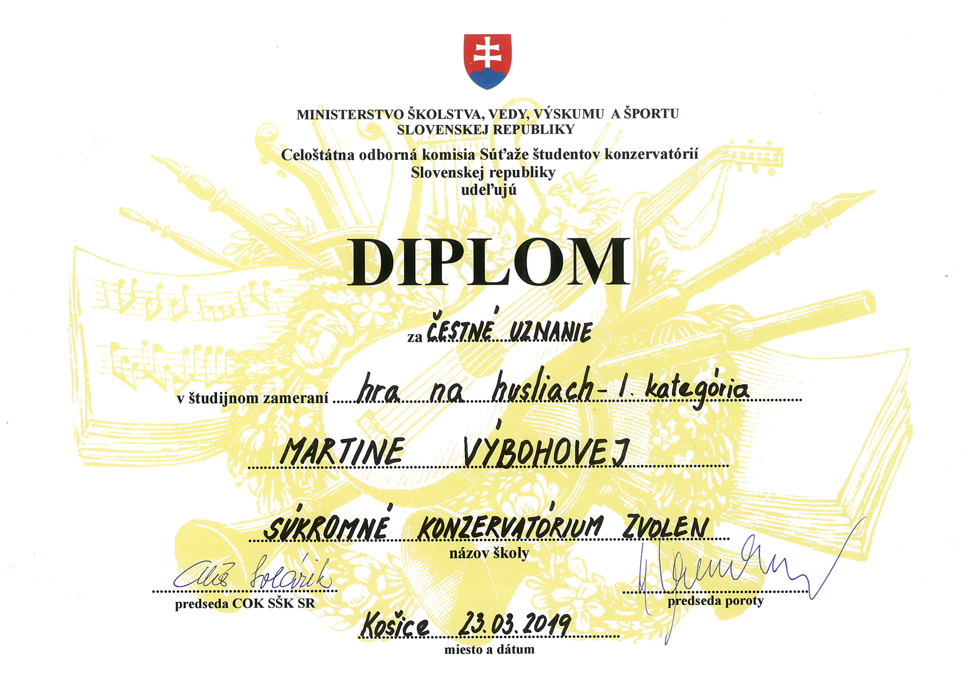 Martine Výbohovej – Súkromné konzervatórium PinkHarmony – čestné uznanie v študijnom zameraní – Hra na husliach – I. kategória, v Košiciach, 23. 3. 2019