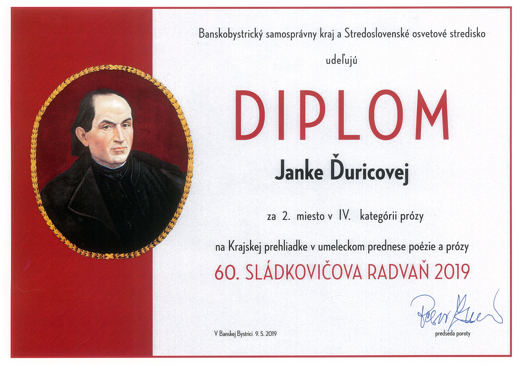 Janke Ďuricovej – Súkromné konzervatórium PinkHarmony – za 2. miesto v IV. kategórii prózy na Krajskej prehliadke v umeleckom prednese poézie a prózy – 60. Sládkovičova Radvaň 2019 , v Banskej Bystrici, 9. 5. 2019