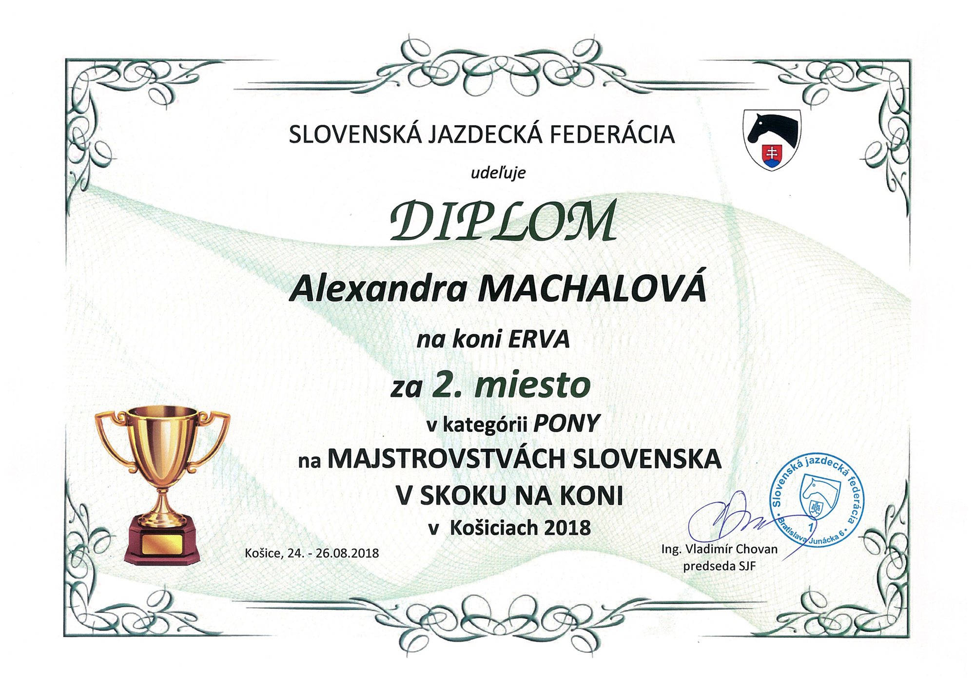 Alexandre Machalovej, – Športové gymnázium PinkHarmony vo Zvolene – 2. miesto na Majstrovstvách Slovenska v skoku na koni v kategórii Pony, Košice 26. – 28. 8. 2018