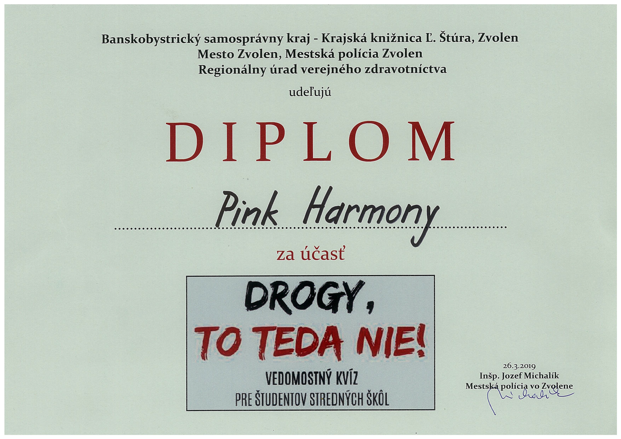 Žiakom Stredných škôl športu a umenia PinkHarmony vo Zvolene – ocenenie za účasť vo vedomostnom kvíze DROGY, TO TEDA NIE! v kategórii odborné Stredné školy, vo Zvolene, 26. 3. 2019