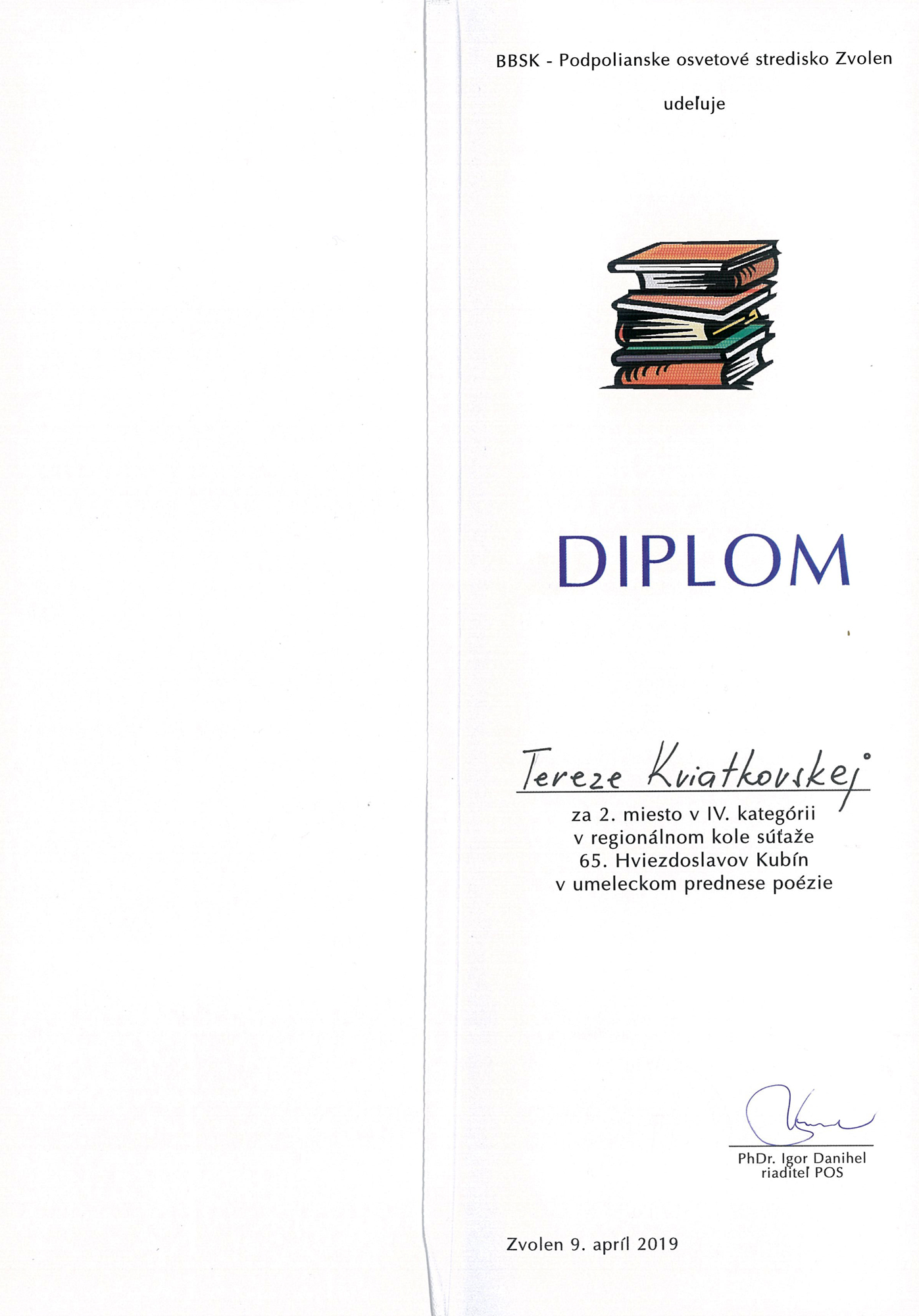 Tereze Kviatkovskej – Súkromné konzervatórium PinkHarmony – ocenenie za 2. miesto v IV. kategórii v regionálnom kole 65. ročníka súťaže Hviezdoslavov Kubín v umeleckom prednese poézie, vo Zvolene, 9. 4. 2019
