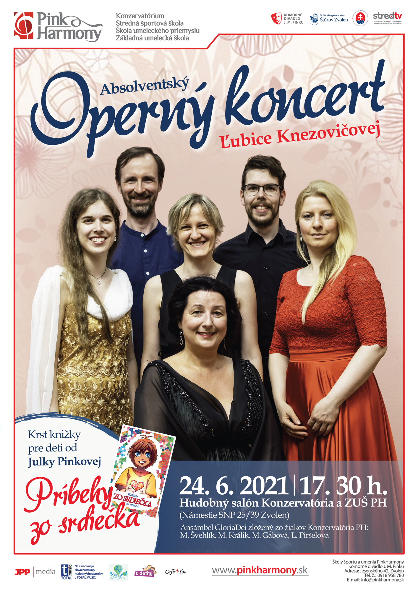 Srdečne Vás pozývame na slávnostný operný Absolventský koncert Ľubice Knezovičovej, v spolupráci s jej žiakmi a žiakmi Konzervatória PinkHarmony – Ansámblom Gloria Dei a zároveň Vás pozývame na krst, v poradí ôsmej knižky pre deti od autorky Julky Pinkovej.