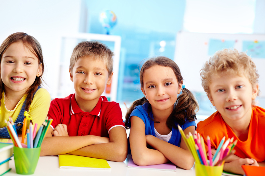 Group of diligent schoolchildren looking at camera in school