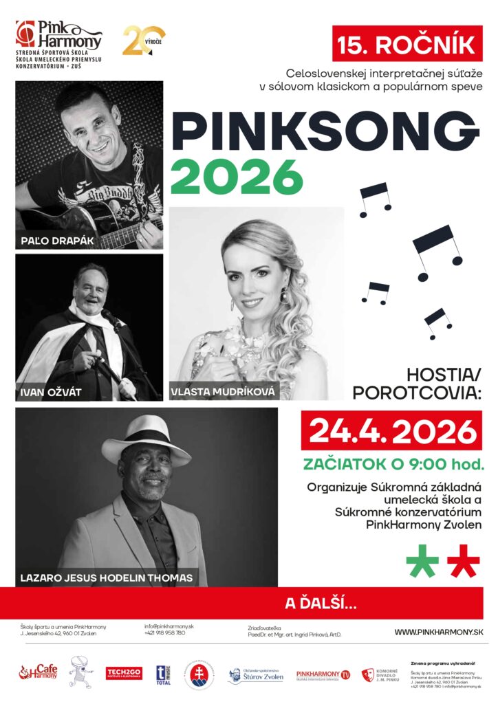 Srdečne Vás pozývame na 15. ročník celoslovenskej speváckej súťaže PINK SONG 2026, ktorú organizuje Súkromná základná umelecká škola a Súkromné konzervatórium PinkHarmony vo Zvolene. Súťaž sa uskutoční 24. apríla 2026 v DK ŽSR vo Zvolene s predpokladaným začiatkom o 9:00 hod.