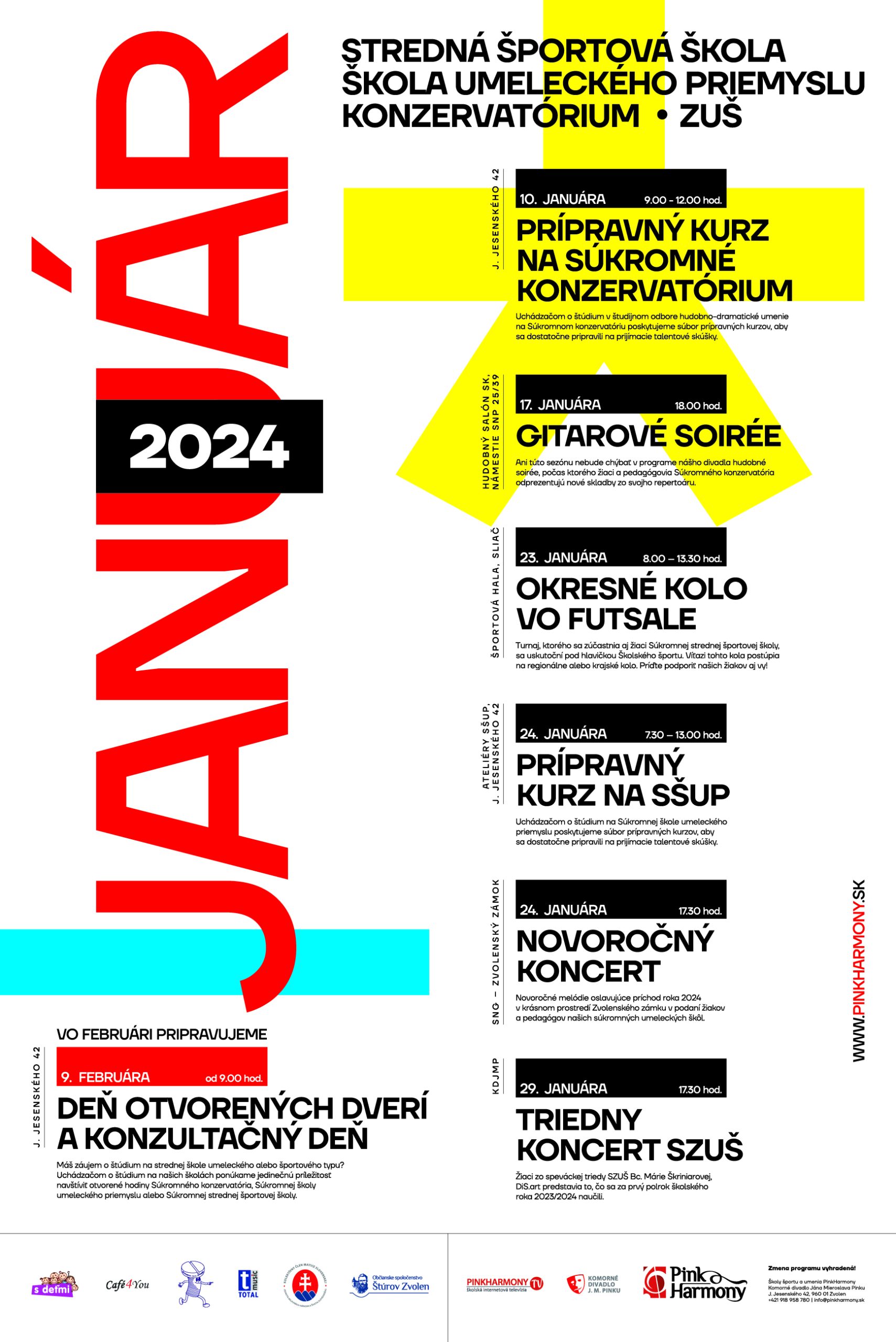 V úvode sa môžete tešiť na hudobný koncert pod názvom Gitarové soirée, ktorý sa uskutoční vo stredu 17.1.2024. Záver mesiaca oživí Novoročný koncert na ktorom sa predstavia žiaci a pedagógovia našich súkromných umeleckých škôl PinkHarmony a spolu privítame nový rok 2024.