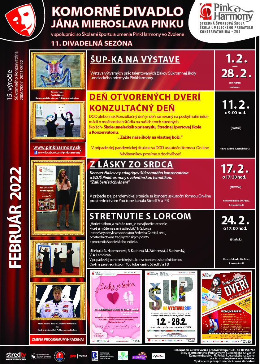 Máme tu február – mesiac lásky. Začiatok februára odštartujeme výstavou výtvarných prác žiakov Školy umeleckého priemyslu, ktorá sa bude konať v Starej radnici vo Zvolene. Plynule sa presunieme na Deň otvorených dverí alebo inak Konzultačný deň, počas ktorého sa budete môcť dozvedieť množstvo dôležitých informácií o štúdiu na našich stredných školách. V druhej polovici mesiaca si určite nenechajte ujsť valentínsky koncert ,,Z lásky  zo srdca“. A záver mesiaca prinesie reprízu divadelného predstavenia Stretnutie s Lorcom. Tešíme sa na Vás 😊