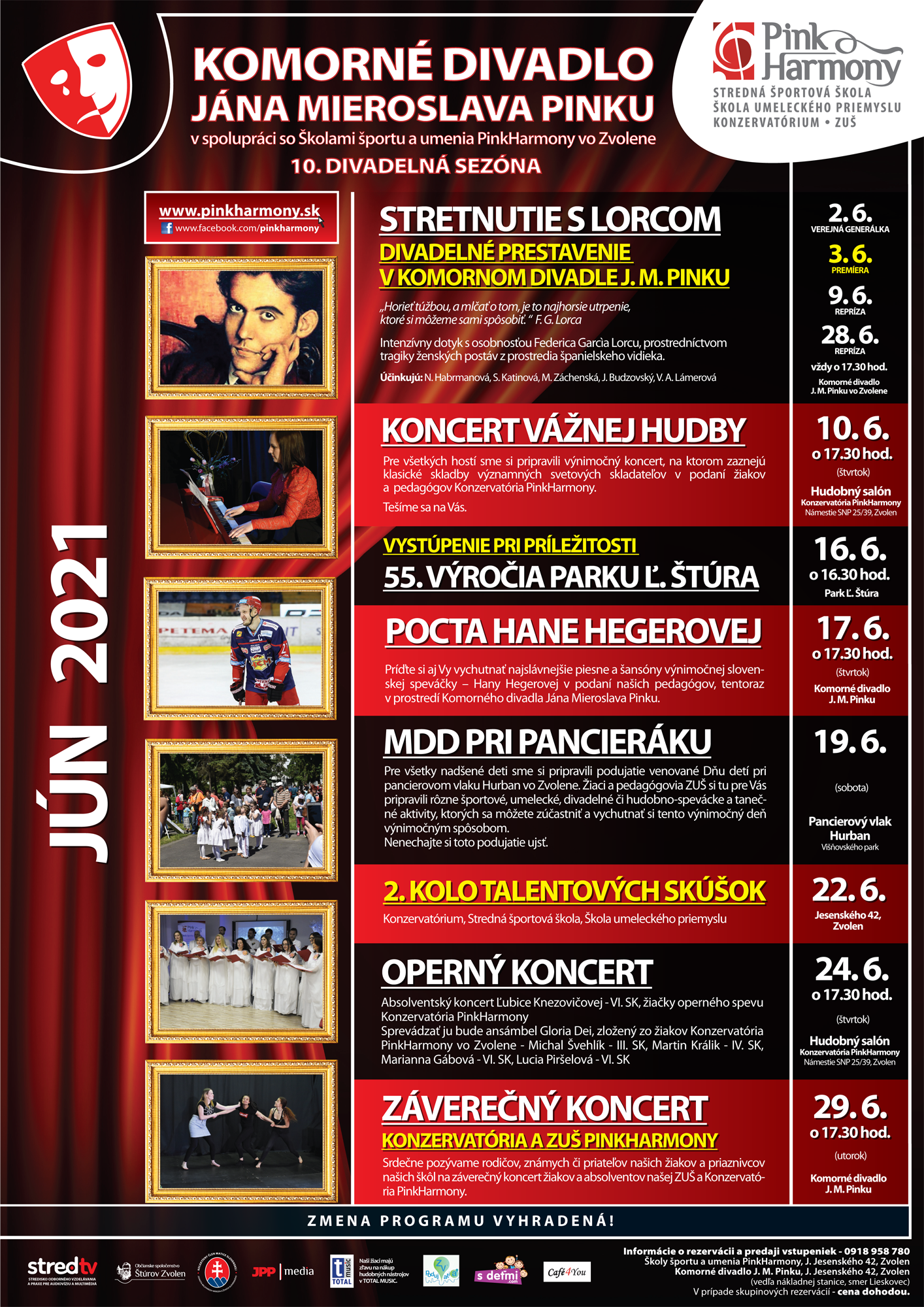 Milí priatelia, mesiac jún bude nabitý skvelým programom. Určite si nás nenechajte ujsť, či už v Komornom divadle J. M. Pinku na divadelnom predstavení Stretnutie s Lorcom, koncerte s názvom Pocta Hane Hegerovej či Záverečnom koncerte Konzervatória a ZUŠ PinkHarmony, v Hudobnom salóne Konzervatória a ZUŠ PinkHarmony na skvelom Opernom koncerte a Koncerte vážnej hudby a samozrejme vo Višňovského parku pri pancierovom vlaku Hurban na Dni detí.
