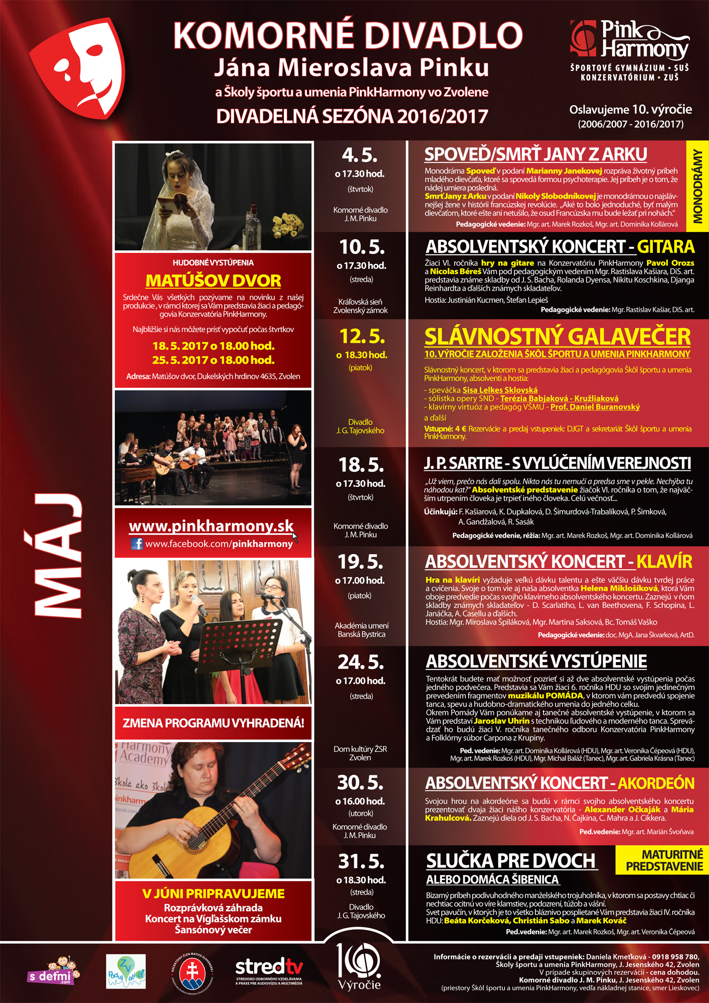 Tento mesiac bude doslova nabitý akciami. Začneme s pokračovaním série Monodrámy a cez Gitarový absolventský koncert sa prenesieme až k hlavnej akcii mesiaca – Slávnostnému galakoncertu, ktorý sa bude niesť v duchu osláv 10. výročia založenia Škôl športu a umenia PinkHarmony. Za ním budú nasledovať absolventské koncerty zamerané na hru na klavíri a akordeóne a taktiež absolventské tanečné a herecké vystúpenia.