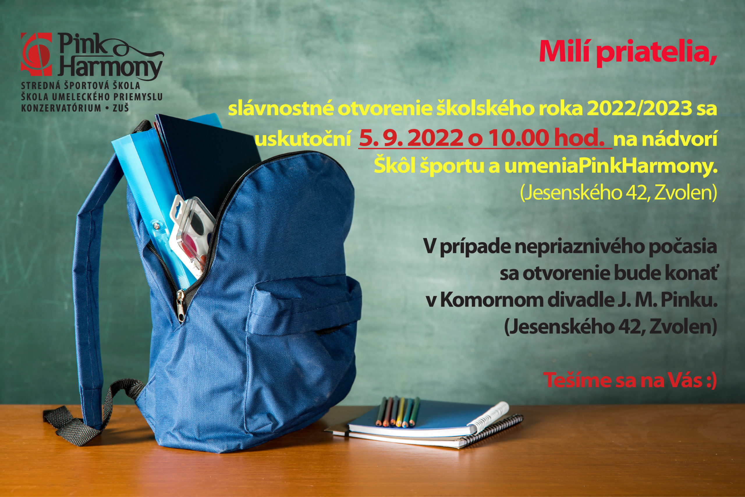 Dňa 5.9.2022 sa o 9:00 na nádvorí školy uskutoční slávnostné otvorenie školského roka 2022/2023.