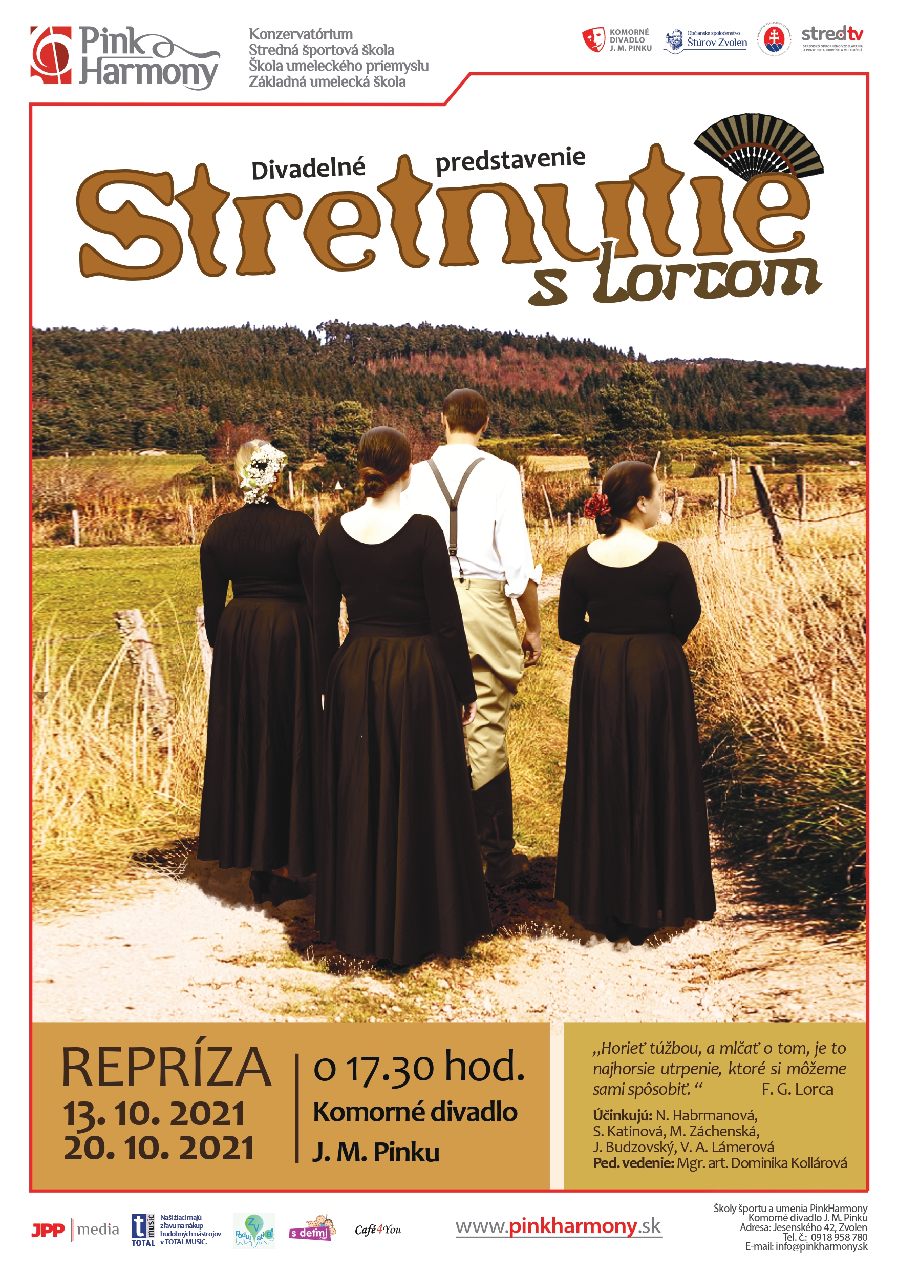 Intenzívny dotyk s osobnosťou Federica Garcìa Lorcu, prostredníctvom tragiky ženských postáv z prostredia španielskeho vidieka vám opäť prináša repríza tohto vynikajúceho predstavenia, ktorá sa bude konať v stredu 13.10.2021 v Komornom divadle J.M.Pinku.