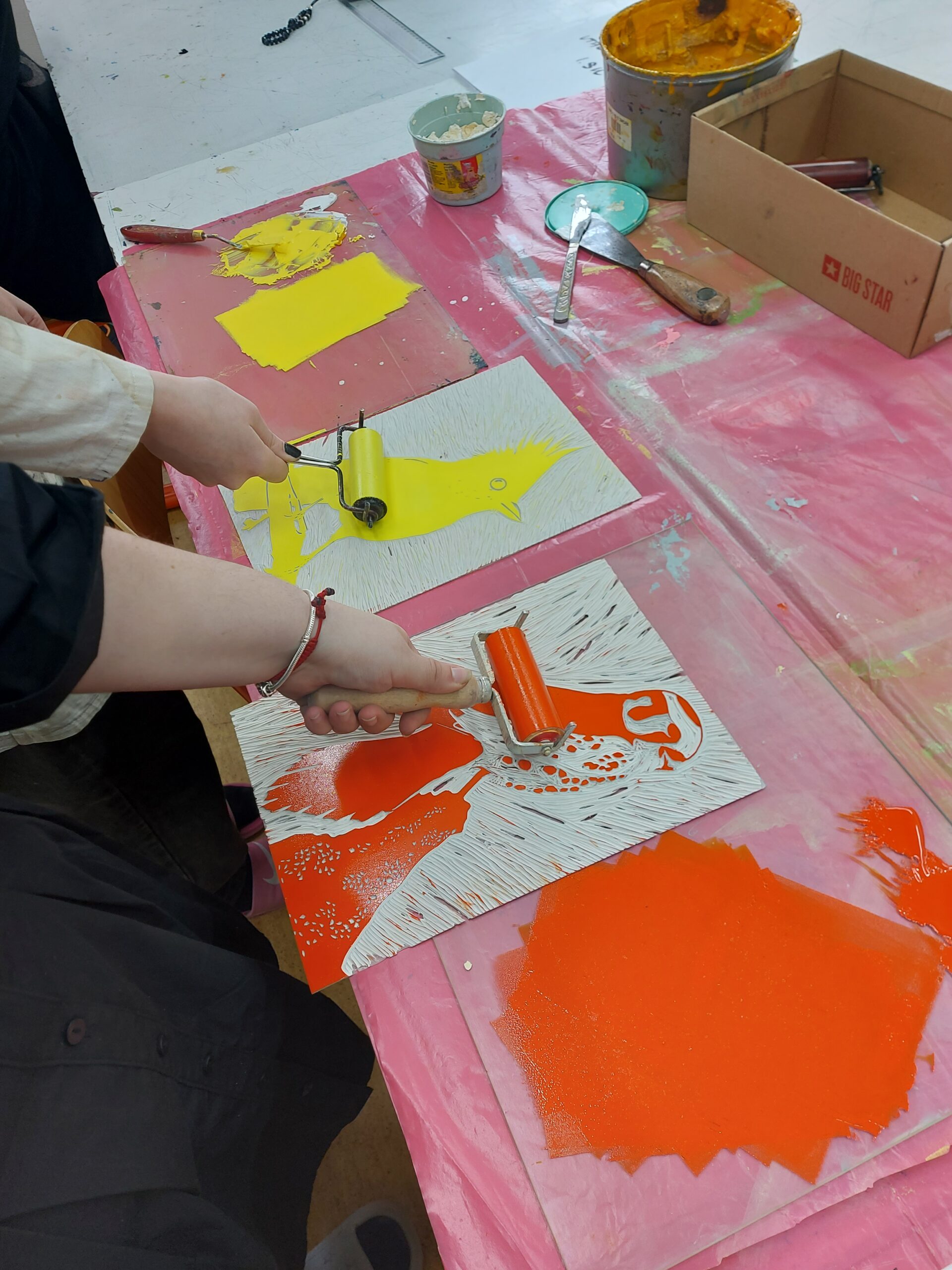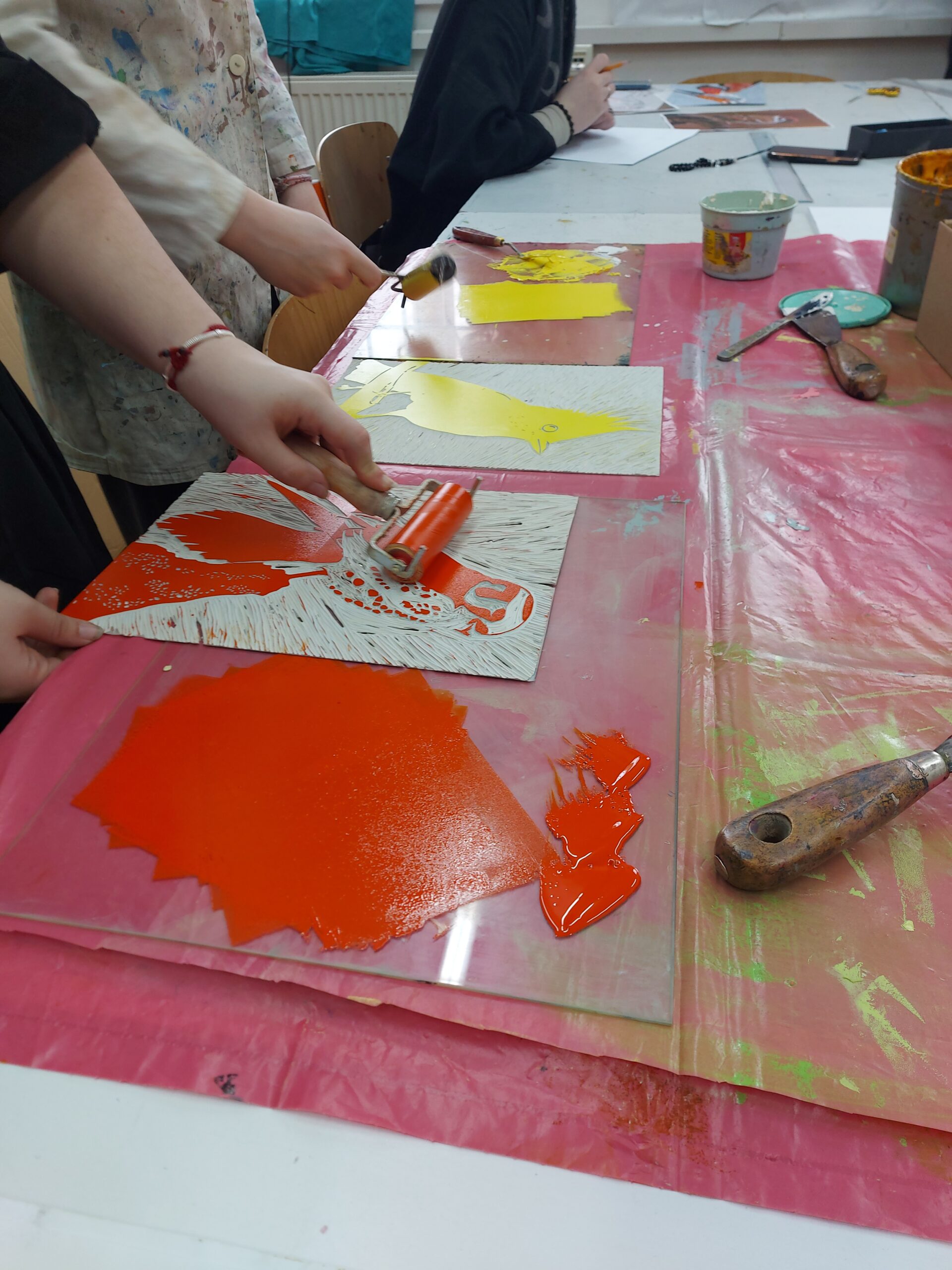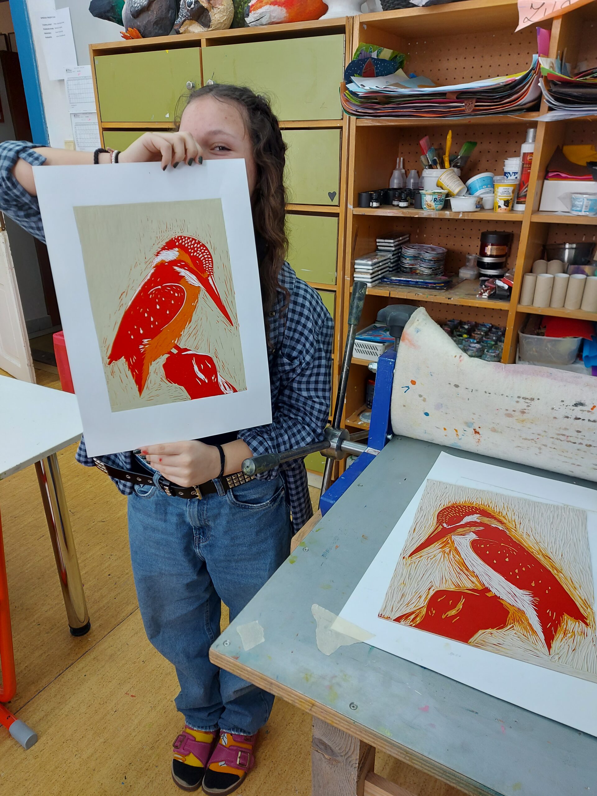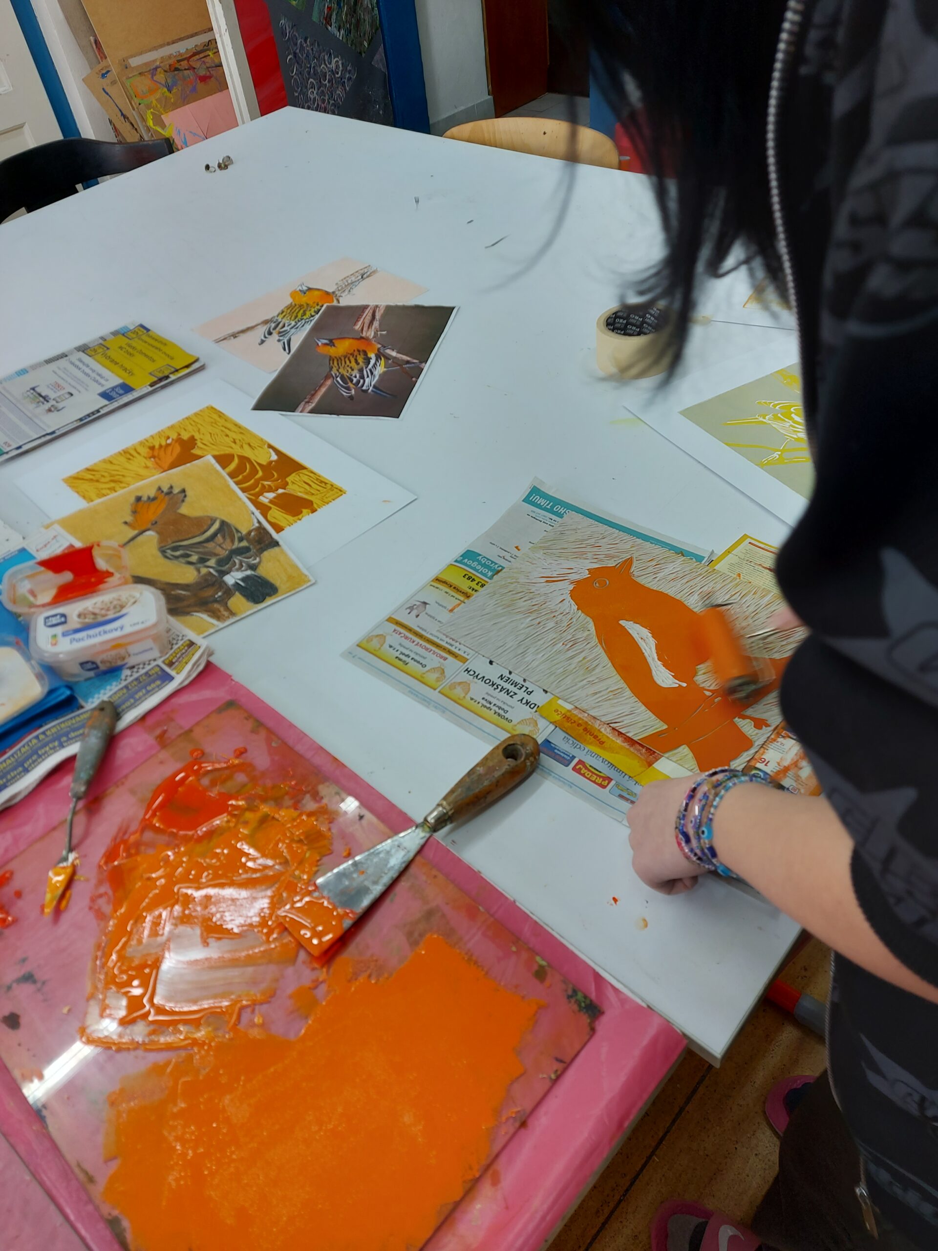 🎨Naši prváci z I.SU na hodine výtvarnej prípravy nezaháľajú a posledné týždne sa intenzívne venujú tvorbe tradičnej grafiky. Realizujú farebné linoryty a postupným odtláčaním jednotlivých vrstiev im na papieri vzniká takéto nádherné vtáctvo. Preto vám radi ukážeme niekoľko fotografií z procesu ich tvorby.