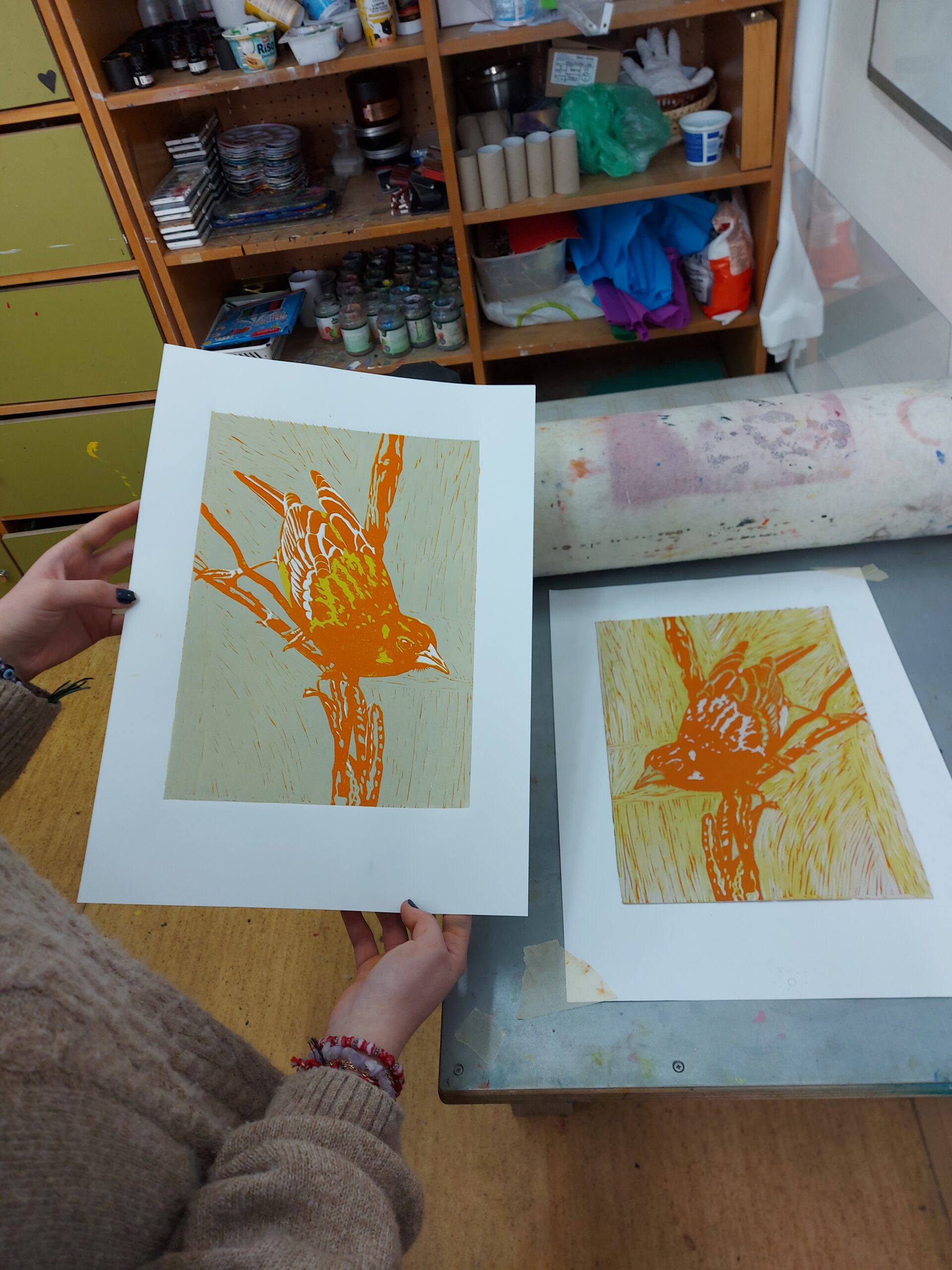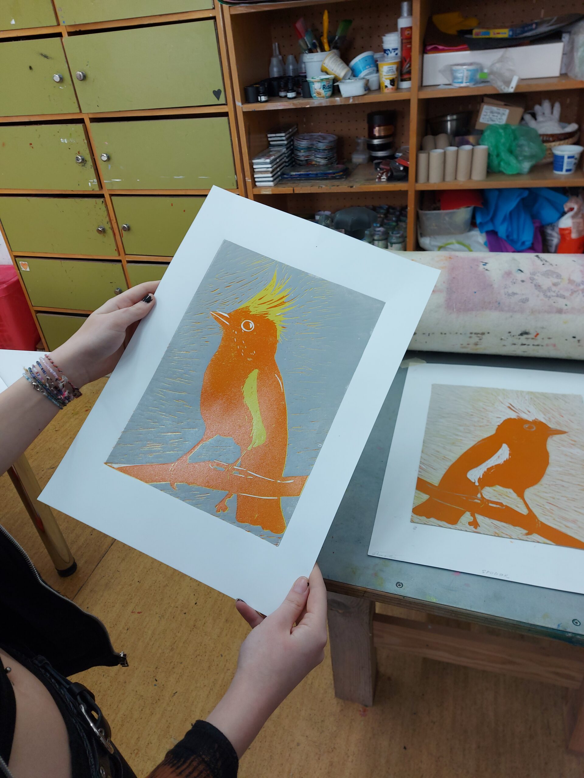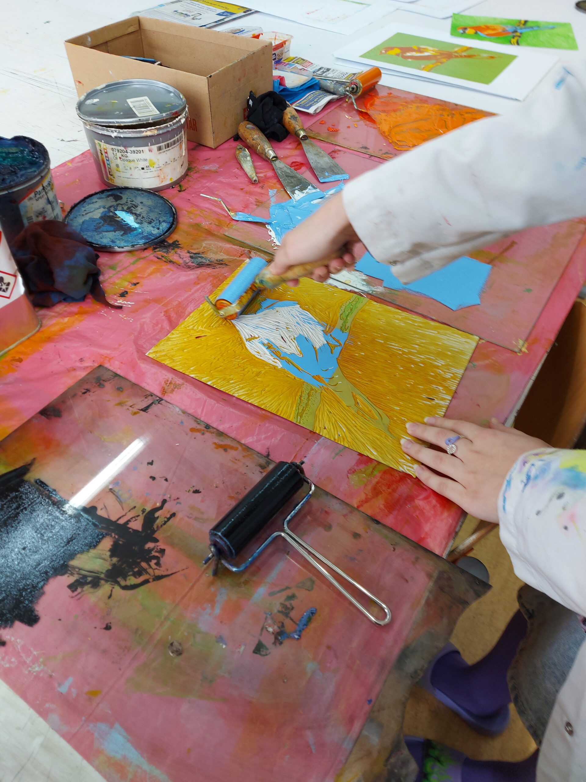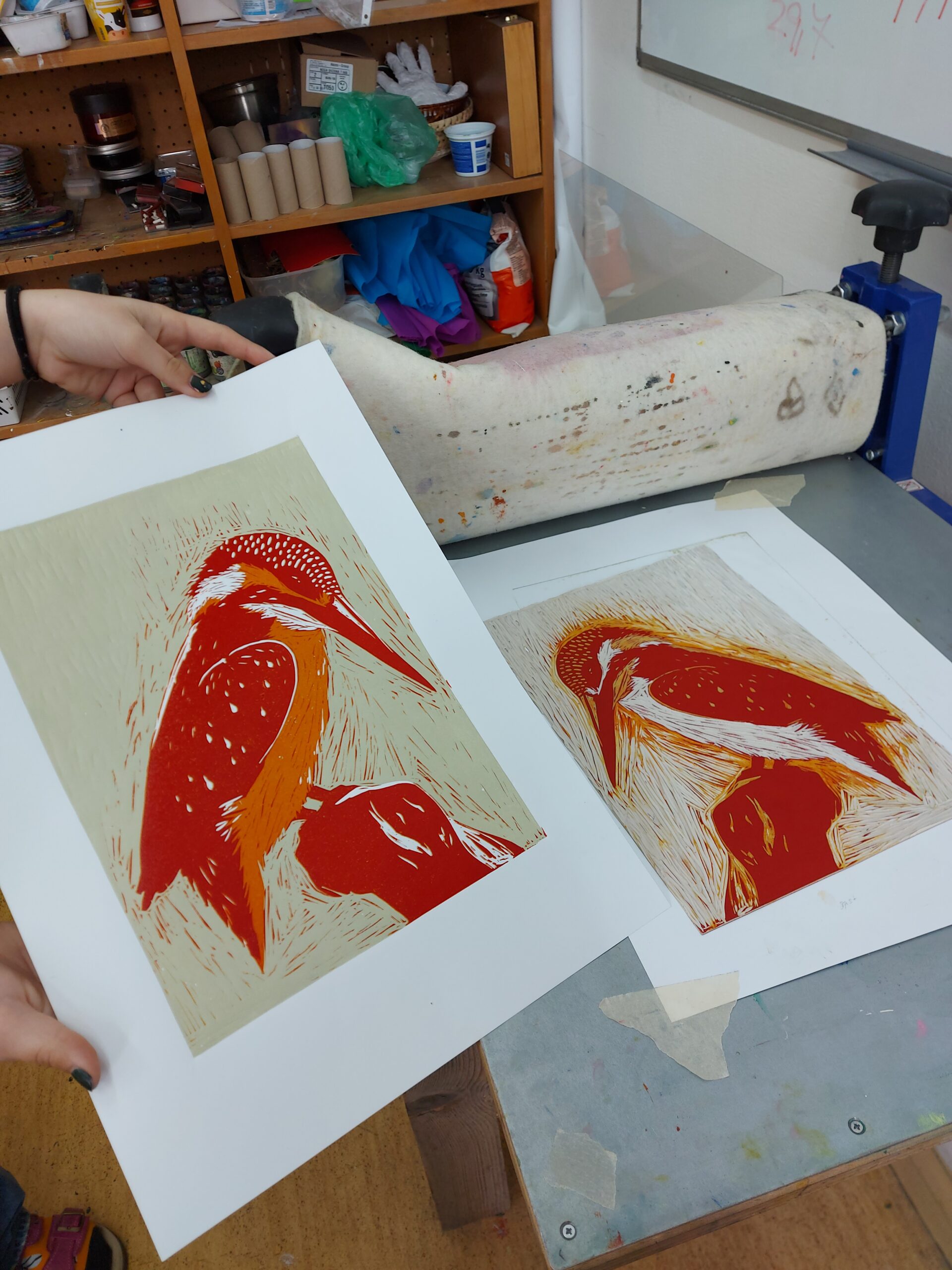 🎨Naši prváci z I.SU na hodine výtvarnej prípravy nezaháľajú a posledné týždne sa intenzívne venujú tvorbe tradičnej grafiky. Realizujú farebné linoryty a postupným odtláčaním jednotlivých vrstiev im na papieri vzniká takéto nádherné vtáctvo. Preto vám radi ukážeme niekoľko fotografií z procesu ich tvorby.