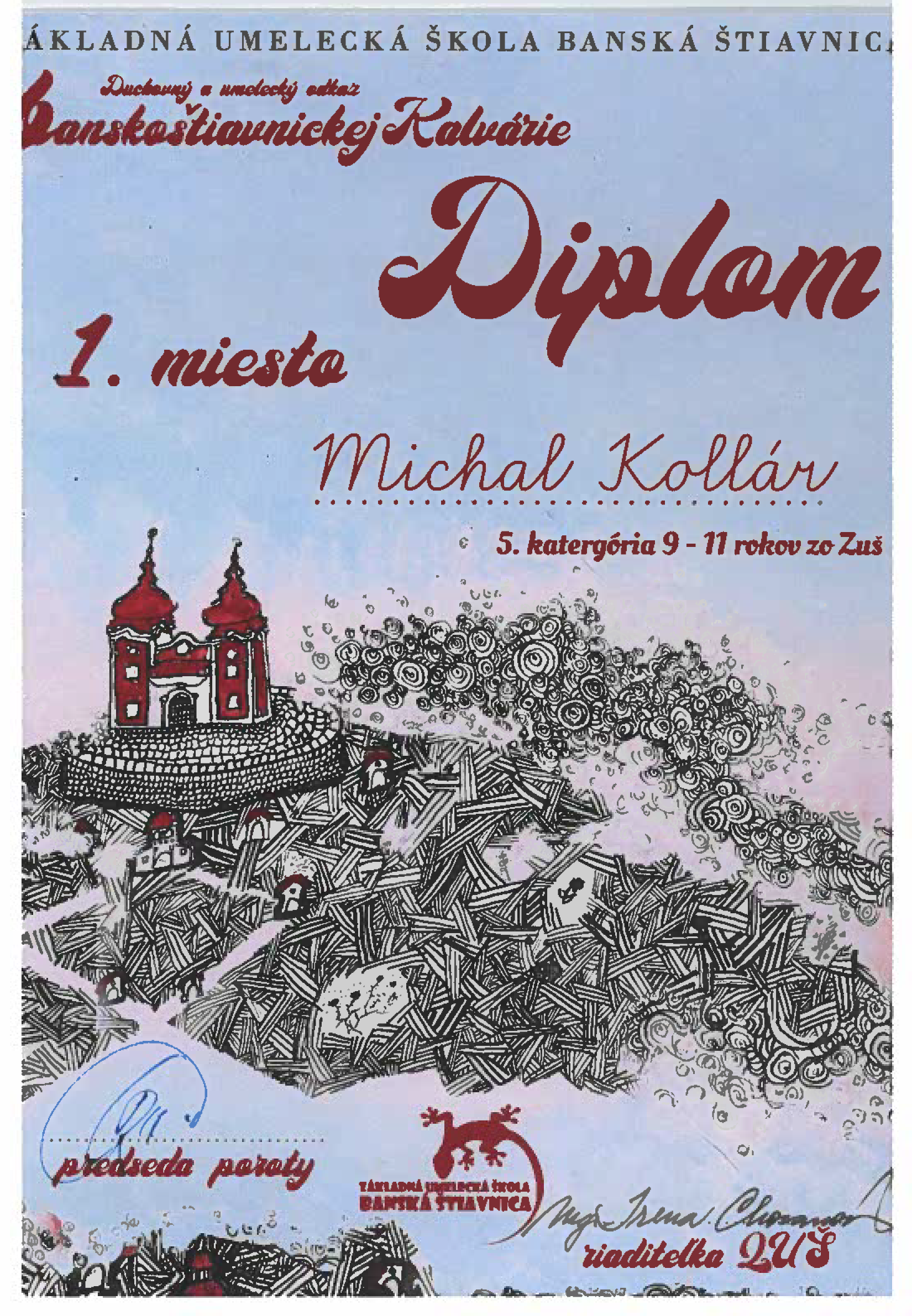 Gratulujeme Michalovi Kollárovi žiakovi našej Základnej umeleckej školy ku krásnemu 1. MIESTU, ktoré získal vo výtvarnej súťaži “Duchovný a umelecký odkaz banskoštiavnickej kalvárie 2022″, ktorú organizovala Základná umelecká škola v Banskej Štiavnici.