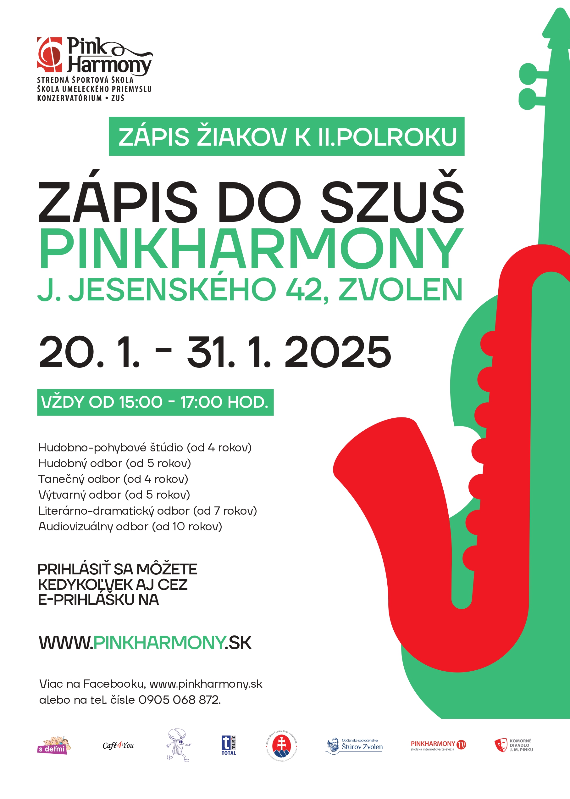 V prípade, že ste sa rozhodli ešte zapísať seba alebo svoje dieťa na našu SZUŠ , môžete tak urobiť kedykoľvek aj v 2.polroku. Radi vás privítame od 20.1.2025 do 31.1.2025 v čase od 15:00 do 17:00 hod.