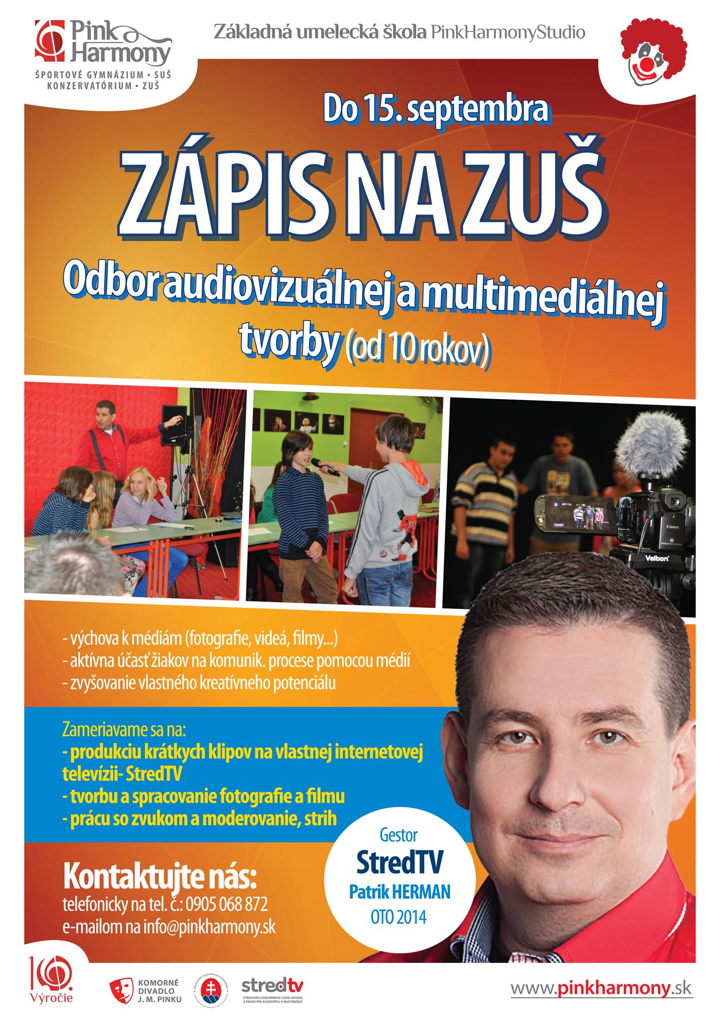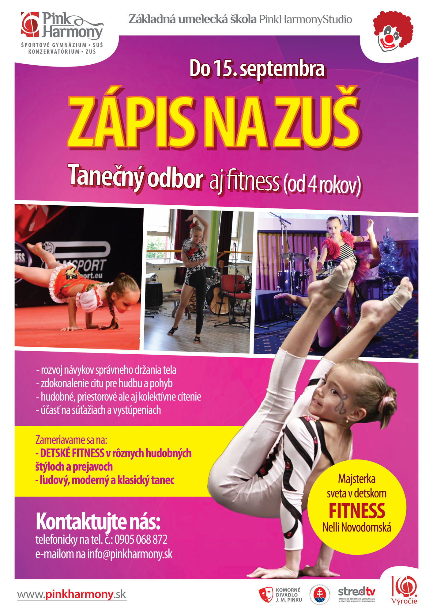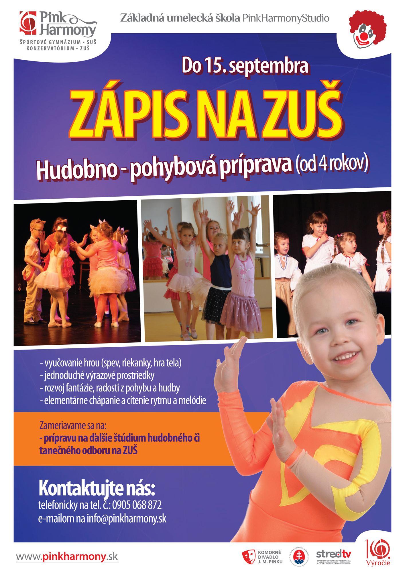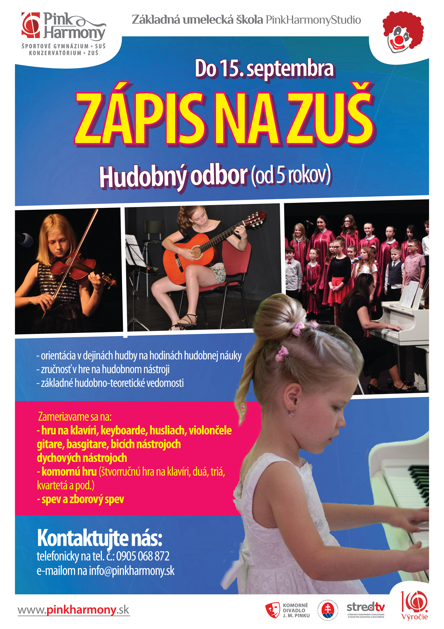Milí priatelia, ponúkame Vám až šesť skvelých odborov, z ktorých si môžete vybrať pre svoje dieťa ten najvhodnejší. Zapísať ho naň môžete až do 15. septembra 2017. Viac informácií Vám poskytneme na e-mailovej adrese: info@pinkharmony.sk alebo na tel. č.: 0905 068 872