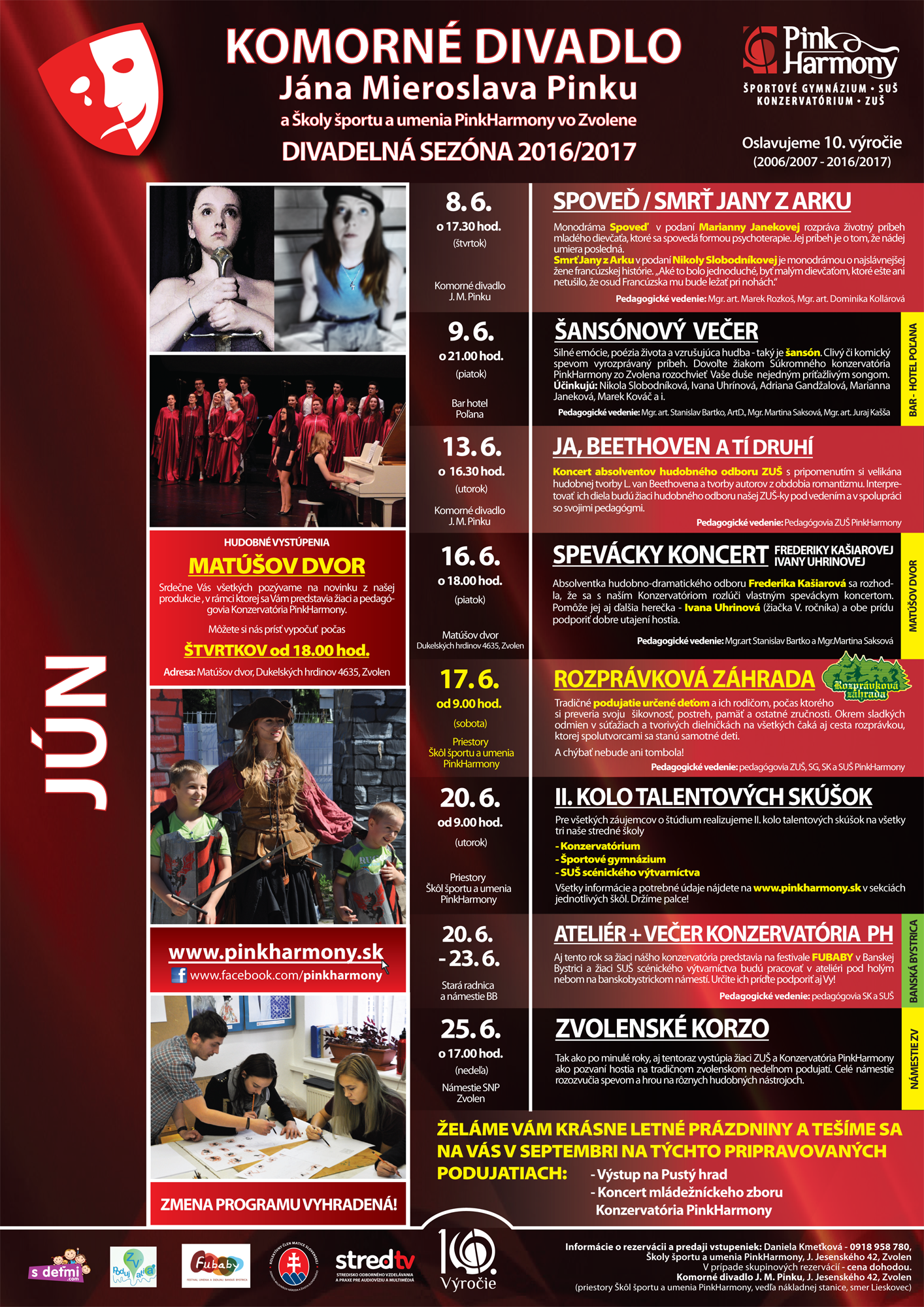 UPOZORŇUJEME NA ZMENU V PROGRAME! Spevácky koncert Frederiky Kašiarovej a Ivany Uhrinovej sa z technicko-organizačných príčin prekladá na piatok 16. 6. 2017 o 18.00 hod. a bude sa konať v Matúšovom dvore. Za pochopenie ďakujeme.